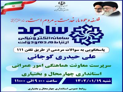 سرپرست هماهنگي امور عمراني استاندار چهارمحال و بختياري روز شنبه 19 فروردين با حضور در سامانه الکترونيکي ارتباط مردم و دولت (سامد) به سوالات و دغدغه‌هاي مردم در حوزه اقتصادي استان پاسخ مي‌دهد.