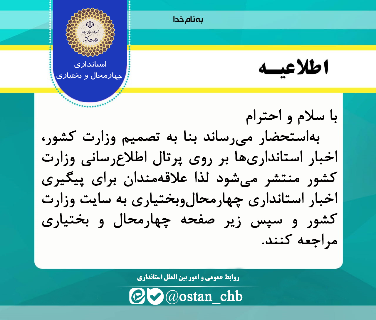 تغيير سايت خبري و اطلاع رساني چهارمحال و بختياري کد خبر: 202023 تاریخ انتشار: 1402/05/28 نمایش: 59312 اخبار اطلاعيه با سلام و احترام بهاستحضار ميرساند بنا به تصميم وزارت کشور، اخبار استانداريها بر روي پرتال اطلاعرساني وزارتکشور منتشر ميشود لذا علاقهمندان براي پيگيري اخبار استانداري چهارمحالوبختياري به سايت وزارت کشور و سپس زير صفحه چهارمحال و بختياري مراجعه کنند.